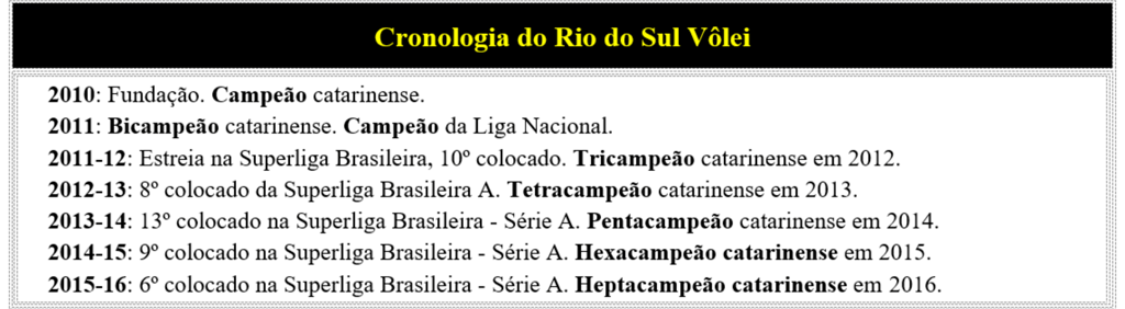 Desde então Rio do Sul veio cativando cada vez mais publico e fãs para o voleibol local, na Superliga a equipe de Rio do Sul sempre se mostrou valente e fazendo grandes jogos principalmente diante de sua torcida, segue abaixo mostrada em fotos um pouco da trajetória desta equipe na maior competição de voleibol feminino de clubes do Brasil.