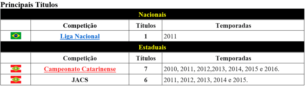 Em 2011 Rio do Sul conquistou a Liga Nacional – Campeonato Brasileiro da 2ª Divisão. Assim garantindo a vaga para a Superliga Brasileira de Voleibol Feminino 1ª Divisão temporada de 2011/12.